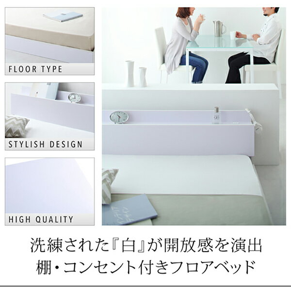 商品詳細 棚・コンセント付きフロアベッド IDEAL アイディール スタンダードポケットコイルマットレス付き セミダブル■ベッドフレーム 【サイズ】 セミダブル:(約)幅126x長さ215x高さ45cm 【材質】化粧繊維板 【カラー】ホワイト 【機能】1口コンセント(1200W) 【品質保証】1年間 【生産国】中国 【梱包サイズ・重量】個口数:1 セミダブル:(約)128x48x19cm・28kg ※各サイズ・重量は概算です。