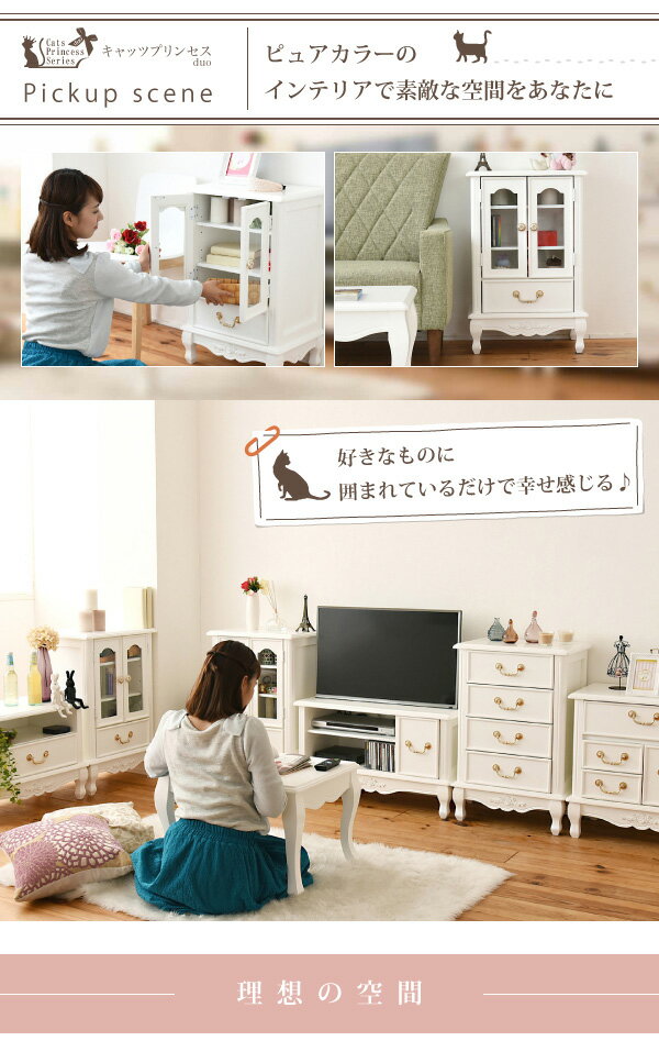 ■商品説明 薔薇のレリーフ、かわいい猫脚、アンティーク調の取っ手がお姫様な気分を演出するキャッツプリンセスシリーズのキャビネット。
