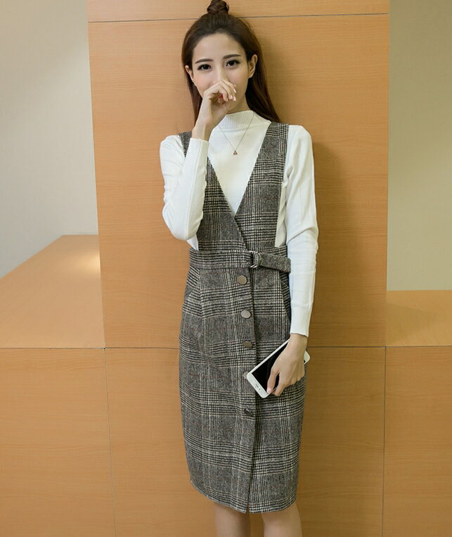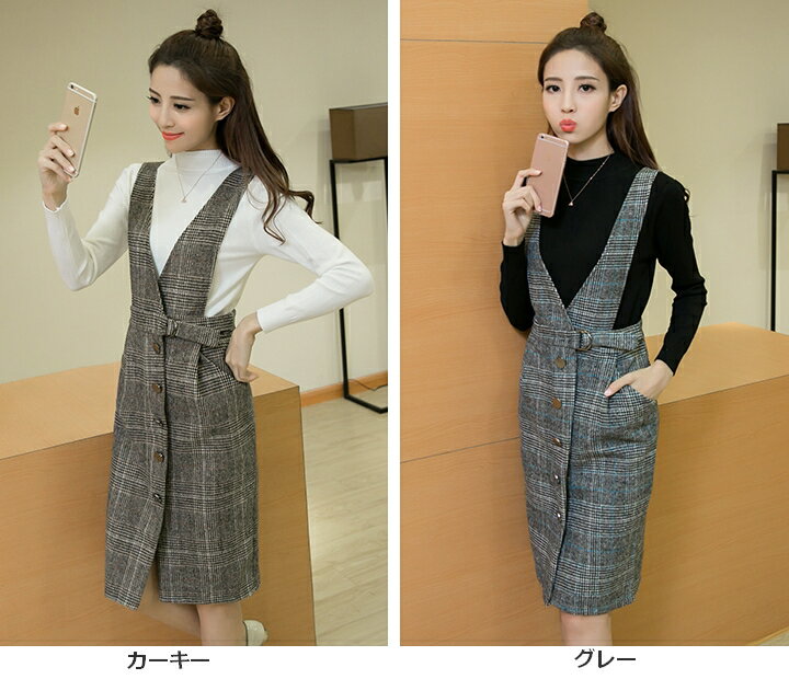 レディース セットアップ 2点セット ニットトップス+サスペンダースカート 秋冬/格子チェック柄 S-XLサイズ 新品未使用品 t-003△△TZY170816-002